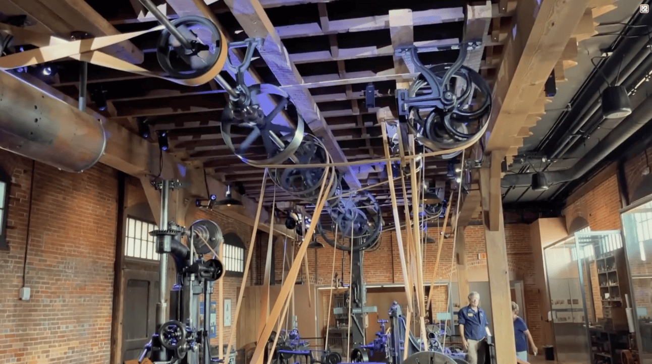 Ceiling-mounted antique belt drive system for a workshop. Via National Mississippi Museum & Aquarium